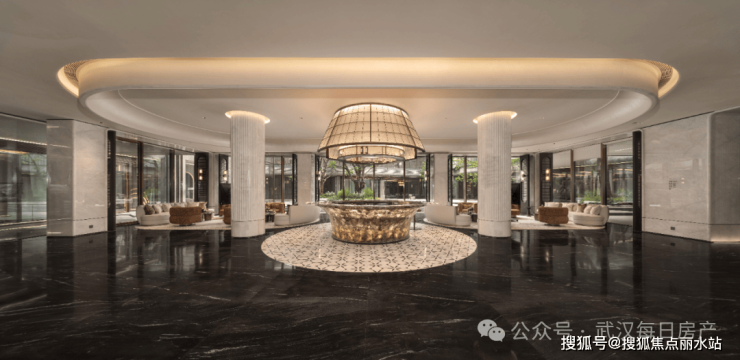 前厅为酒店式落客设计,运用大量奢石;四水归堂的黑石水景以法国进口宝格丽奢石铺就。
