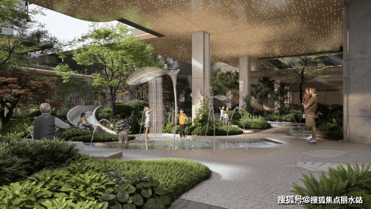以儿童区为例,在儿童游乐主题的架空层,一部滑梯从架空层盘旋而下,直接贯穿至下沉庭院内;滑梯旁,就是供孩子们嬉戏的戏水池。