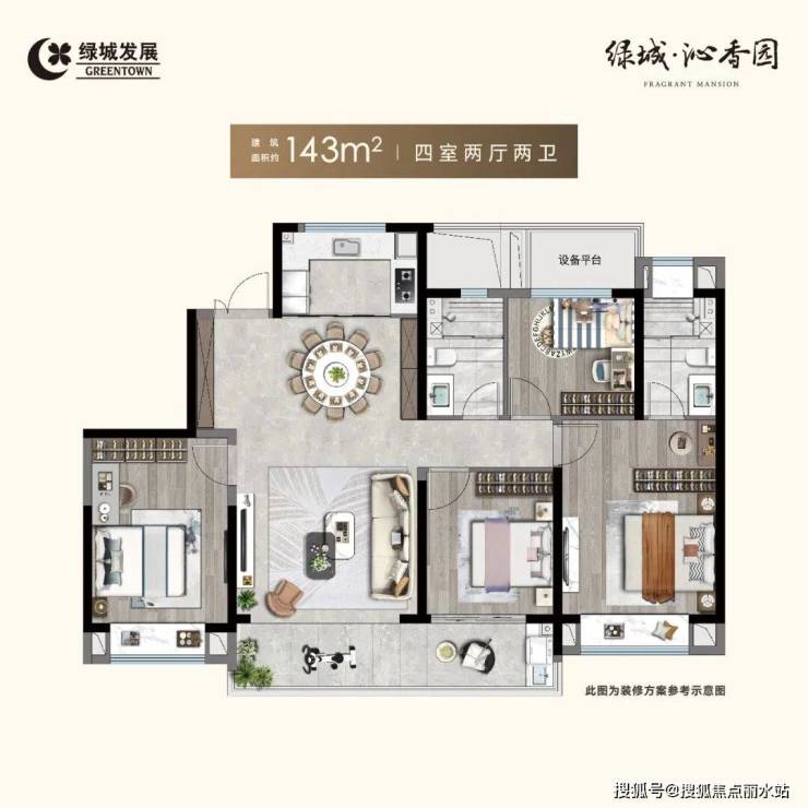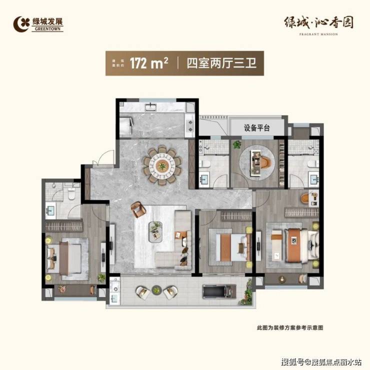 建面约172㎡户型,四房两厅三卫,适合深度改善的全家居住场景,双主卧的配置,无论是主人房还是老人房,均带独立卫生间,照顾不同年龄段生活需求,居住私密感更高。