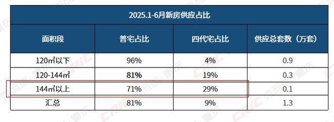 2025上半年重庆中心城区新房供应数据显示,在建面120-144㎡面积段的产品中,四代住宅供应占比达19% 左右。而建面144㎡以上的产品中,近3成为四代宅。