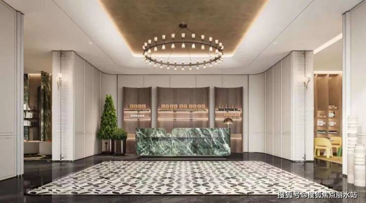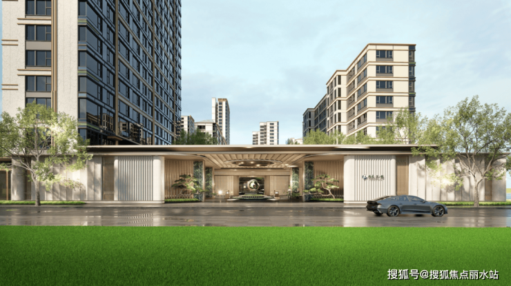 地块西侧与市政公园的结合部位,打造了一个融合下沉景观庭院与会所空间在内的主入口。主入口门头达52米,高度与架空层齐平,通体铝板与石材打造,体量巨大的主入口中央是以雕塑为视觉中心的酒店式落客区。落客区下车后,两行行道树引导行人至挑高三层的酒店式入户大堂内部。从地块红线到酒店式入户大堂,有超过50米的进深。这个距离一方面强化了整个社区的归家仪式感,同时也给从城市界面到社区内部之间形成了柔性过渡。很有些传统建筑从仪门穿廊庑再到前厅的仪式感。