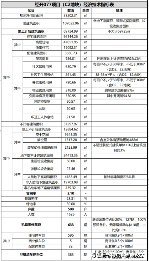 项目容积率为2.1,建筑密度23.31%,总户数为508户,机动车停车位633辆,其中住宅停车位596辆,商业停车位5辆,非机动车停车位385辆。