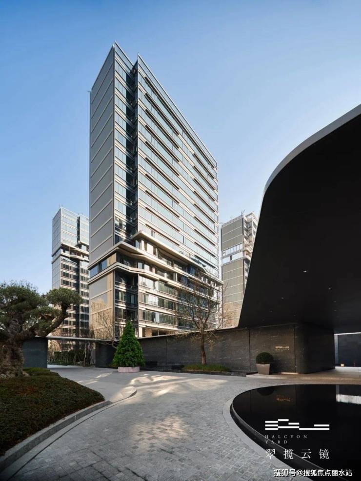 在前文提到的超级界面,巴西进口的大面积云黑石墙面不断横向延展,形成约80米的震撼尺度。约800年的进口橄榄树,搭配冠幅高度达到15米的巨型朴树,更是强化了前场的门面效应。