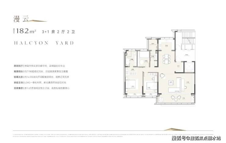 建面约182方户型,拥有约14.9米的南向开间和约7.9米的跑道式阳台。LDKG一体化空间,结合约3.2米的建筑层高,充满了大宅的优越感。