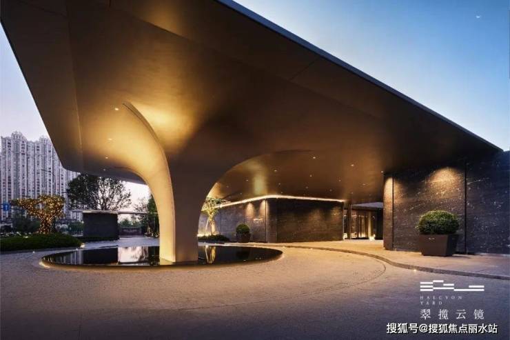 再往前走,就是翠揽云镜打造的台州首个约80米酒店式环岛门庭落客区。核心区域采用了高端酒店比较经典的纵向门廊设计,向外连接着环岛,向内串联着后场水瀑中庭和精装归家大堂,从而为业主提供了非常大气的廊下灰空间。