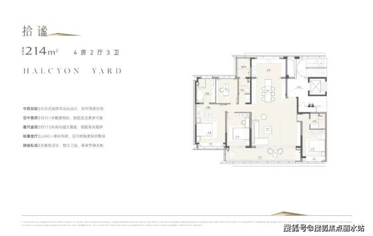 建面约214方户型,更是把南向尺度扩展到了约17.5米。约3.3米建筑层高,再加上约10.1米的阳台,就像一处私家专属的观景台。