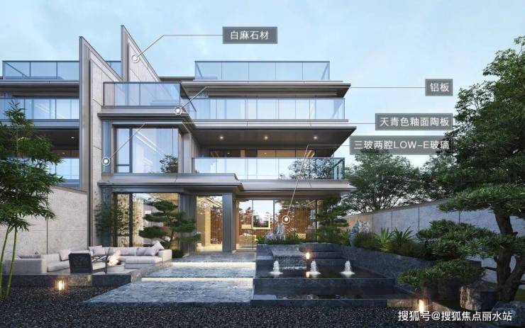整个立面,用料繁多,工艺复杂,营造水准,即便置于杭州、上海等一线顶豪市场,也堪称惊艳。