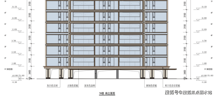 6、从7#楼小高层建筑立面看,整体极具东方审美,顶部有金顶华盖,建筑主体南立面窗墙占比极高,材质多是玻璃搭配铝板,还有少量石材等,底部还有整层架空。首层层高3.4米,标准层也有3.15米;从公示规划看,部分楼座层高达3.3米甚至以上。7#楼边户拥有270°大环幕视野,南北都有开敞式阳台(或设备平台改造)。