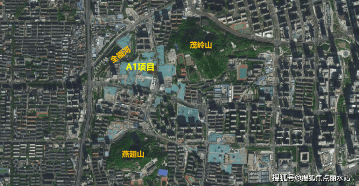 如果从卫星地图鸟瞰A1地块周边,东侧的茂岭山和南侧的燕翅山像拱门一样环绕保卫着A1地块,全福河回旋环绕于地块周围,恰好形成“双山拱卫、一水绕堂”的独特景观。