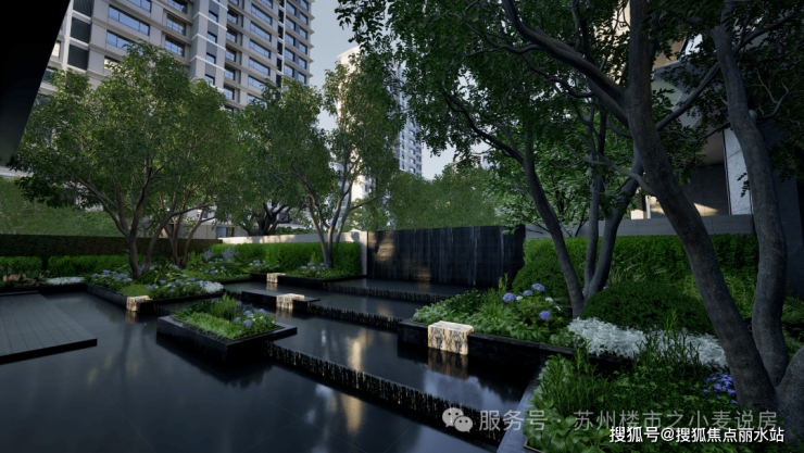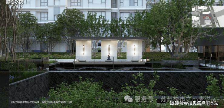 静心水院,400平镜面水景,与大师建筑两两相望;选用黑金砂花岗岩,波纹荡漾中,倒影与池底辉映,更显星级酒店式的静谧与雅致。