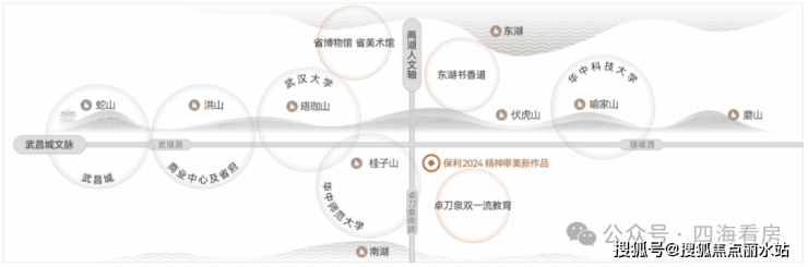 武汉发展主轴,城市文脉轴心:择址武汉城市中轴线上,武珞一路串联城市繁华中心与顶配资源,踞武昌城市发展主轴与东湖生态主轴交汇的城市文脉十字轴心。