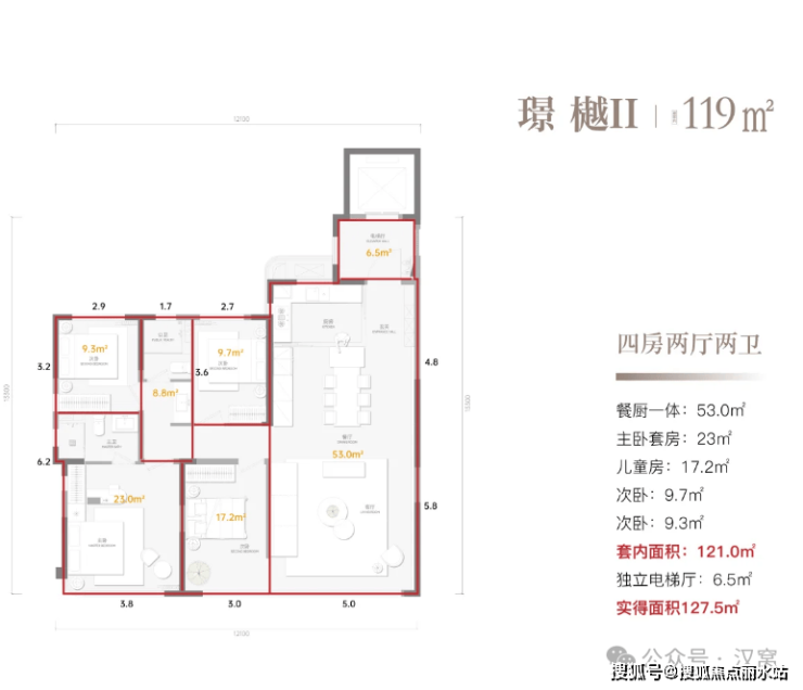 建面约119平,实得面积约127平,得房率约106%。南北通透三面采光的边户,独立电梯入户,同样也有独立电梯前室可以利用。