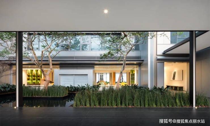 新睿樾府,运用浅色系石材,搭配大面水景、草坪,配以景亭、全冠乔木、可以随意聊天social的休憩小品,还原阿那亚式度假的松弛、马尔代夫白马庄园般的惬意。