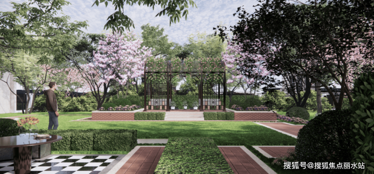 各种景墙、廊架的门洞背后,又有花池喷泉若隐若现,完全是中式造园的框景手法。