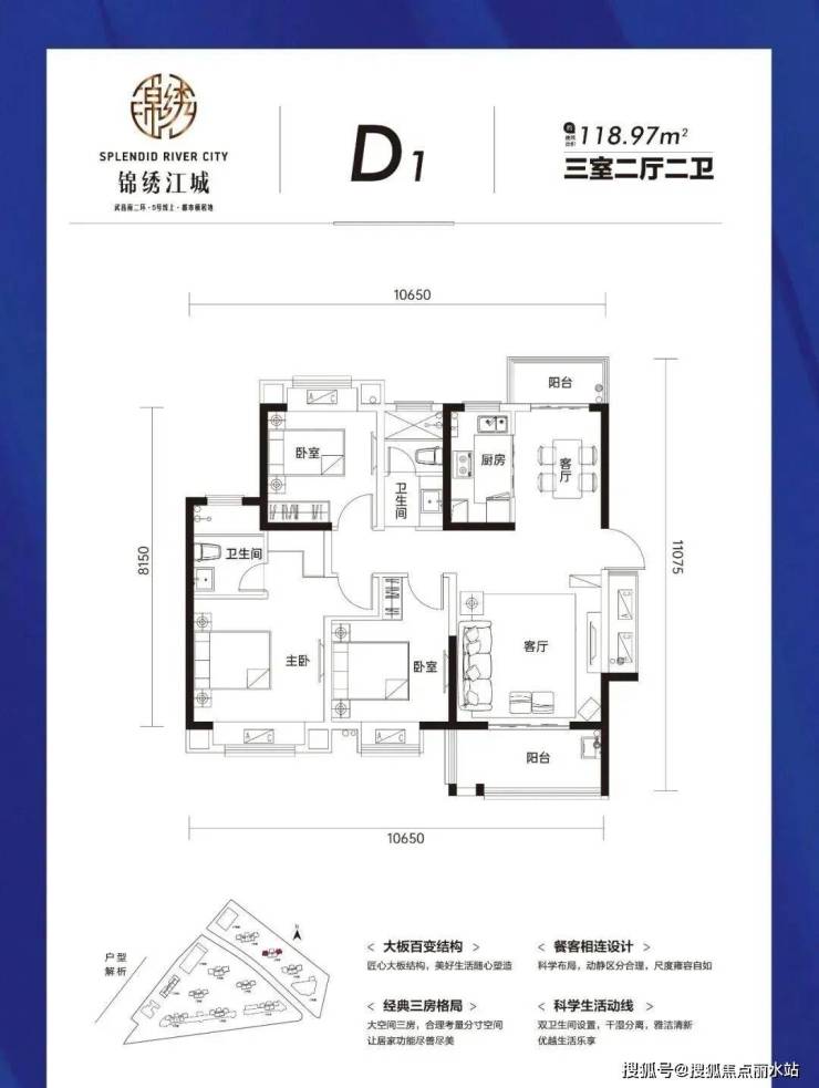 该户型动静分区明确,餐客厅连为一体,能实现很好的通风、对流,居住舒适度高;且南北双阳台,三个卧室带飘窗,优化面积多;是白沙洲为数不多的小面积边户,坐享更低的总价、更高的舒适度。