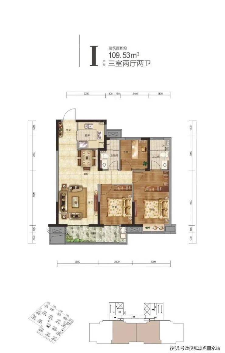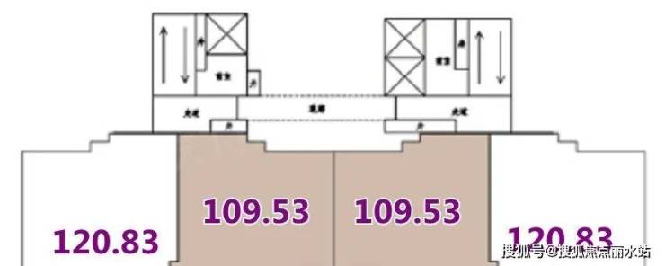 I户型建面约109.53平,三室两厅两卫:此户型位于中间户,连廊结构,三开间朝南,也是目前市场上非常流行的中间户。
