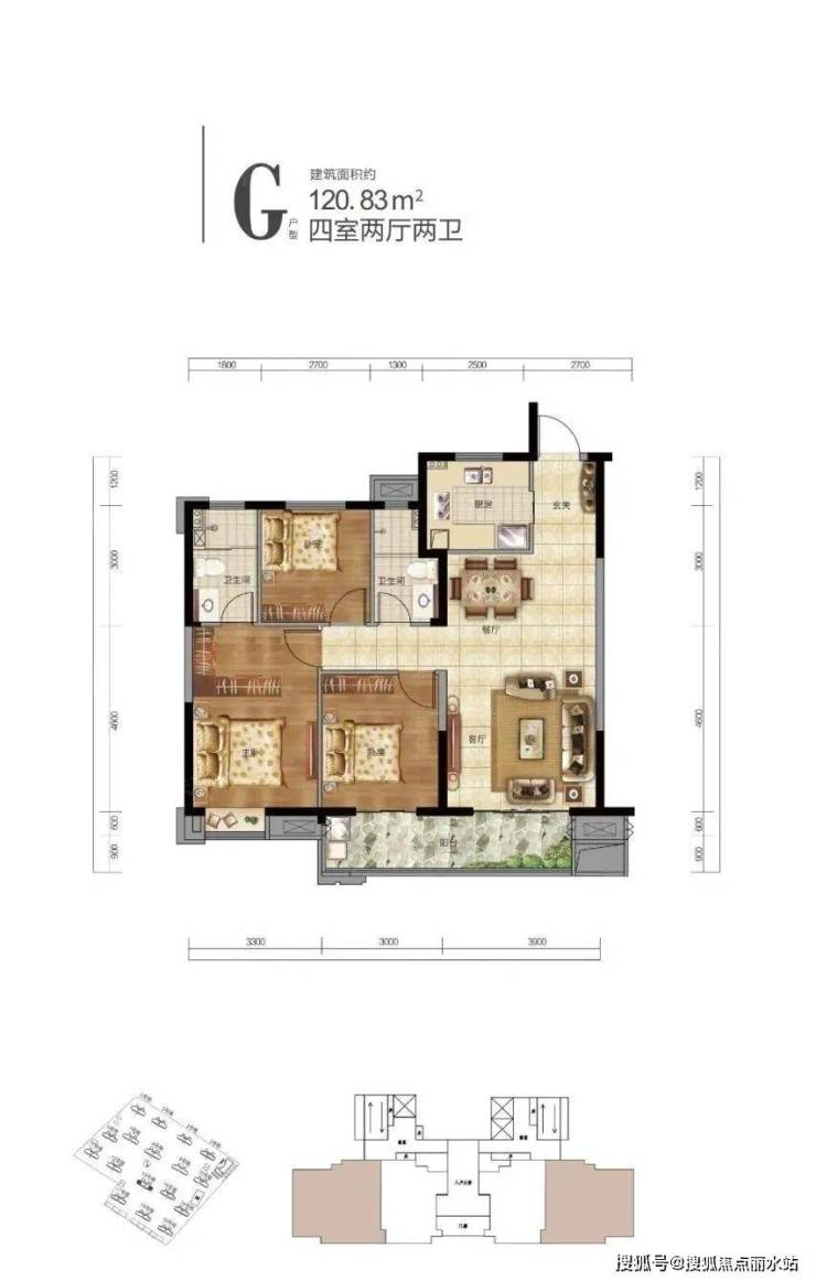 G户型建面约120.83平,三室两厅两卫:此户型位于边户,南北通透,非常方正,和上个户型的布局很一致,不过这是边户。这个户型图上写的四室,但实际应该是三房。