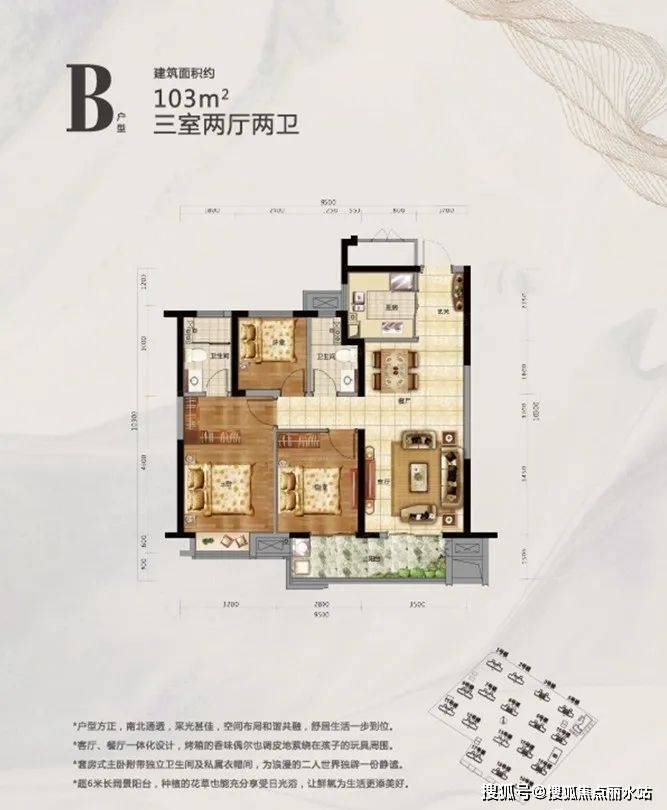 B户型建面约103㎡,三室两厅两卫:该户型位于中间户,与上面109㎡户型基本一样。