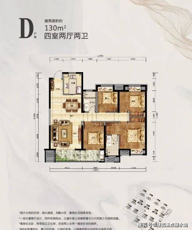 D户型建面约130㎡,四室两厅两卫:该户型位于边户,也是三开间朝南,南北通透,但该户型南向面宽更宽,采光更好,私密性也更加;出阳台外,三间卧室均有飘窗,可以优化面积多。不过过道比较长,有点浪费面积。