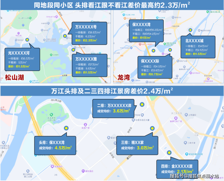正所谓“江景诚可贵,头排价更高”,买江景一定要买头排。以广州为例,珠江一二排江景房差价约10-15万/㎡,价格相差一半。以及东莞松山湖同小区一排看湖不看湖的房子差价2.3万/㎡,万江头排及四排江景差价去到2.4万/㎡。