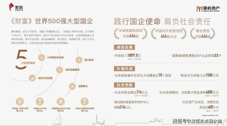 象屿地产——综合型城市服务运营商。作为国企背景,象屿集团的全资子公司、《财富》世界500强企业。象屿地产1993年成立至今30年的成熟开发经验,已有多个样本去证明其前瞻性的市场预判和产品审美高度。