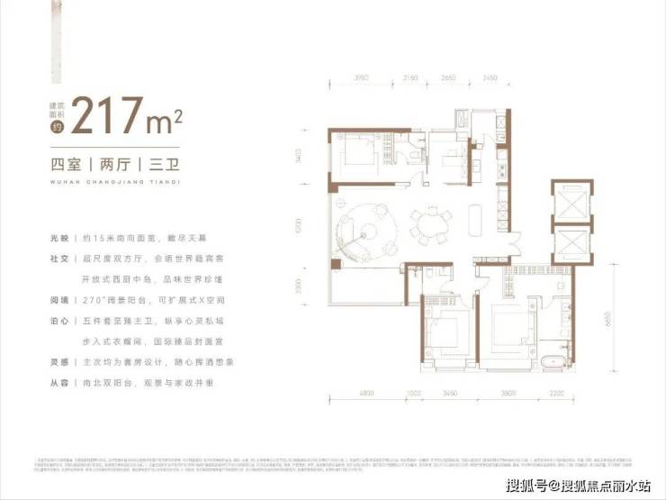 该户型客餐厅非常方正,活动区整体性强,家居摆放、家庭成员活动都有足够空间;加上类“四叶草”布局的洄游式动线,无论是居家、聚会、或洽谈,都能互不干扰,完美继承了武汉天地户型的设计理念,确实是本期的户型担当。