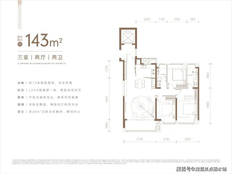 该户型客厅约5.1米的超大开间,LDKB客餐厨一体设计,活动区功能性强;主卧约20平的超大空间,除了独立卫生间,衣帽间的空间也更充足。