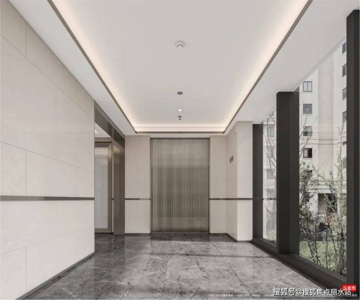 游园之后,便来到了业主归家动线上的最后一环-精装入户大堂,石纹地面、温馨灯池、金属线条、格栅装饰,呈现高级简约的空间之美。