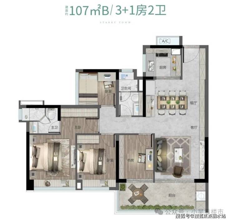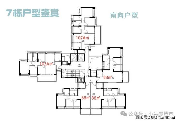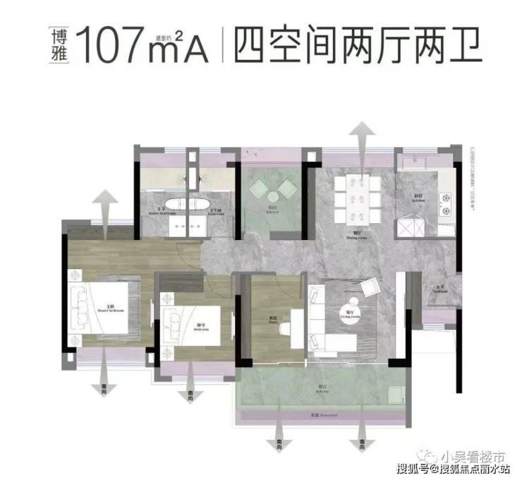 建面107平四房两卫,分为A-B两种户型,四开间朝南,开间达5.9米,动静分区,约5.9-6.1米景观阳台,总价360-410万左右。