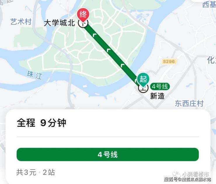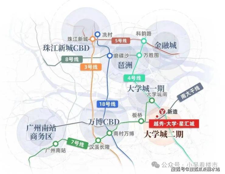 项目距离地铁4号线新造站约1.6公里,交楼后小区东门开放可以直连广医南路,距离地铁站可以控制在800米左右,算是步行可以接受范围内,乘坐4号线1站可达大学城、3站万博、4站琶洲、5站金融城。