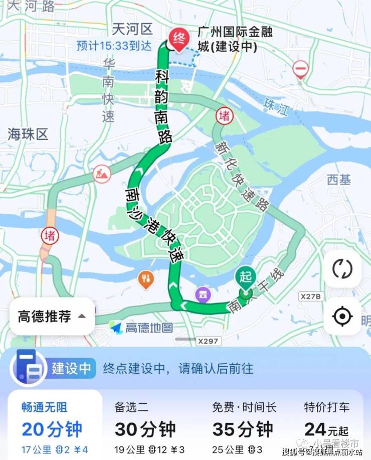 自驾去金融城:南大干线转南沙港快速,去往金融城17公里,高速费4元,全程耗时20分钟左右。