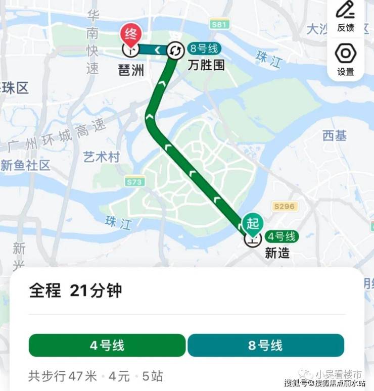 地铁前往琶洲:乘坐4号线4个站到万胜围换乘8号线,全程5个站,总共耗时34分钟左右。