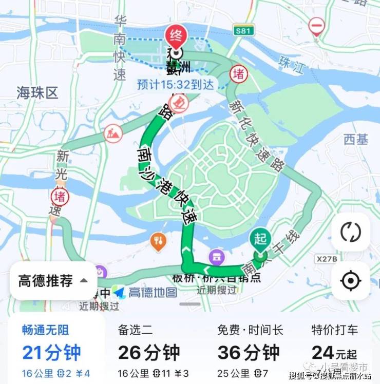 自驾去琶洲:出来走南大干线,再转南沙港快速,到科韵路,全长16公里到琶洲,耗时21分钟左右。