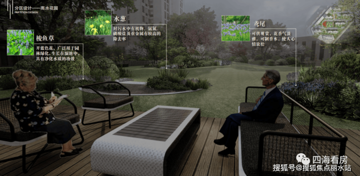 老年人休憩场地、雨水花园,芳华延续与知交畅叙幽情