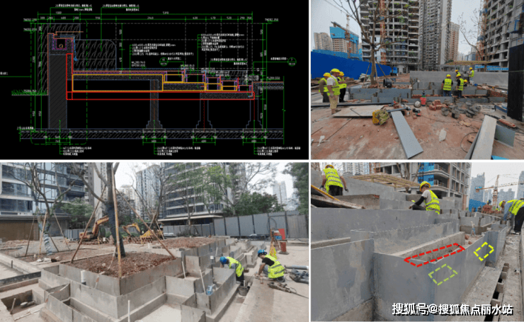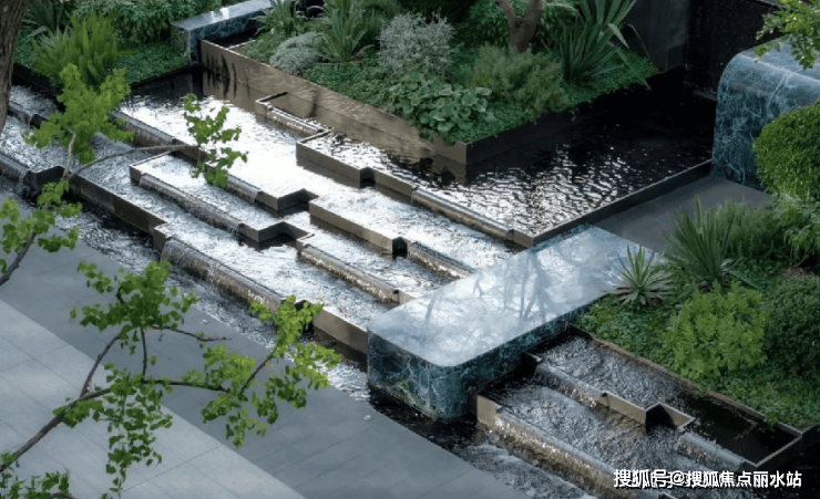 为兼顾能耗与景观,项目团队创新工法打造叠级水景。针对水景结构复杂问题,梳理线条并制作可视化交底模型;通过整体浇筑主体水池,构建二次叠级结构,并以砌体填充与止水钢板焊接加固;待二次结构完工后,打磨钢板出水口保证出水均匀,将内侧池壁低于出水口7 - 8cm,同时强化防水,控制蓄水钢板超5cm防溢出;此外,为方便后期清理,每级水景均设独立排空装置。