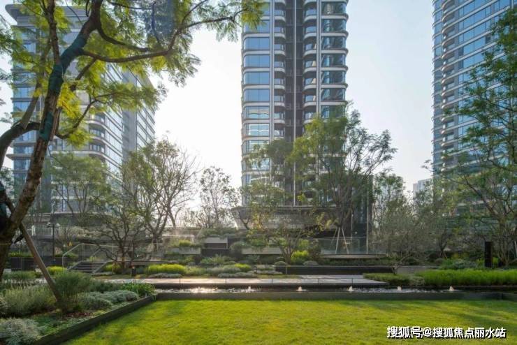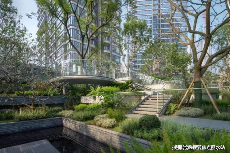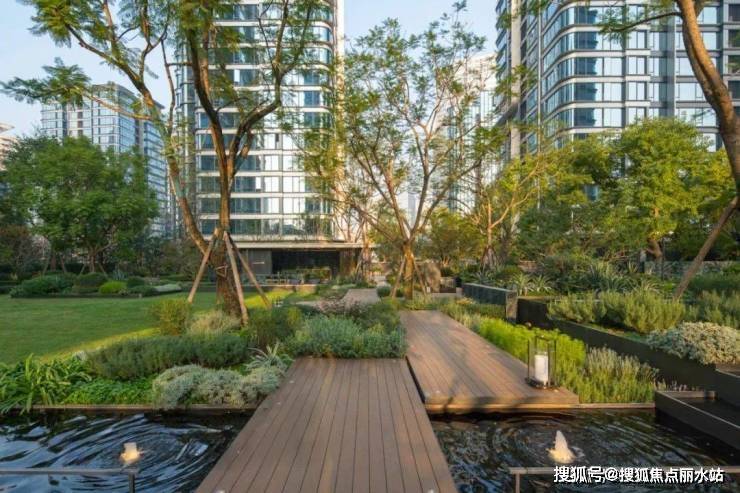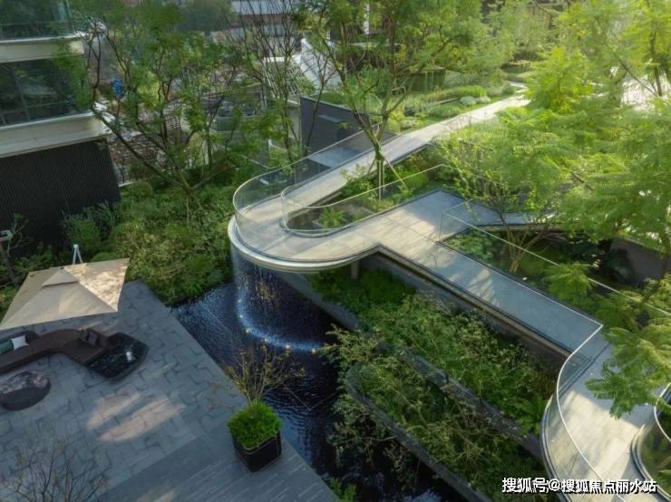 草坪、虹桥、瀑布、花境相互映衬,水汽、花香、草香相互交融,共同勾勒出一幅层次丰富、动静相宜的中庭盛景,尽显自然之韵与生活之美。