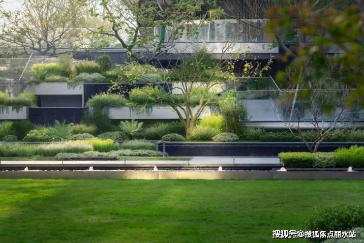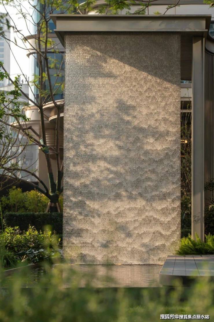 水帘下方,低矮灌木排列紧密,且造型精致,叶片在微风中轻摆,点缀其间的小花,为景观增添了一抹亮色 。