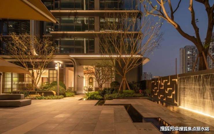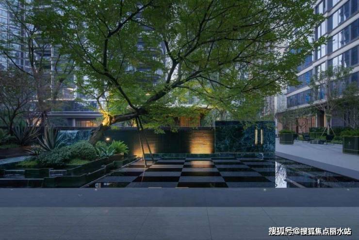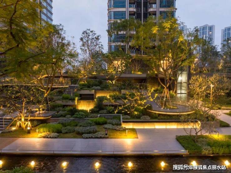 水景波光粼粼,暖暖的灯光从水底透出,如梦似幻,景墙经灯光布局,造型立体感十足,藤蔓影子投射墙面,宛如水墨画,光影交织下,构成如梦似幻的夜间盛景,令人沉醉 。
