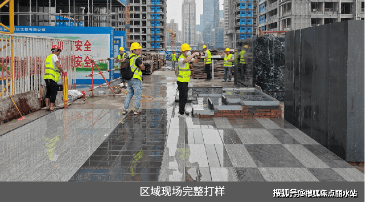 由于项目地面铺装规格繁杂,为实现拼接缝整齐美观,项目团队提前预演对缝情况,固定各类饰面材料加工尺寸,统一下料,从源头规避对缝误差;同时,针对各类饰面景观元素,均先行打样,确认效果达标后再开展大面积施工,保障景观效果契合设计;甚至,在局部仿石砖洗缝时,为防止爆边,使用专业刀片作业,经打样确定工艺后,全面推进洗缝施工,保障洗缝质量与砖体外观 。