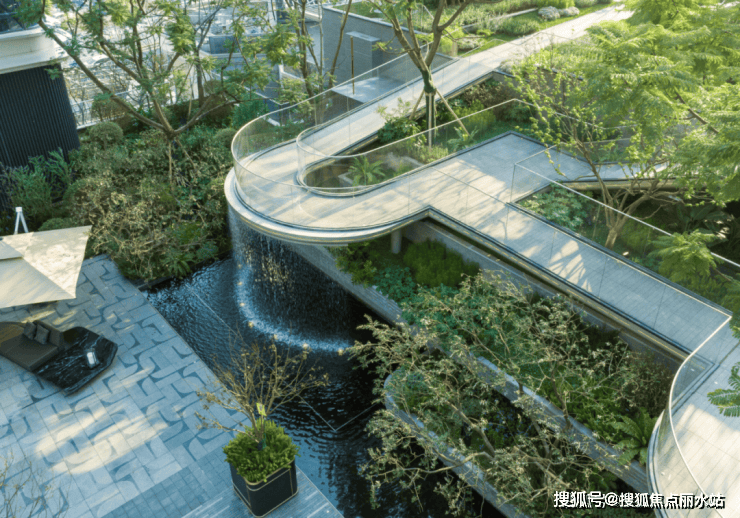 踏入中庭,阳光草坪似绒毯铺展开来,散发着勃勃生机,抬眸,虹桥飞架,其下瀑布奔腾,水花如练,在池中激起层层雪浪,奏响激昂乐章。周边花境花卉色彩斑斓,高低错落,微风拂过,花枝摇曳,芬芳四溢。
