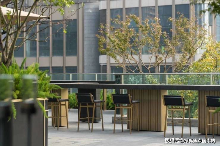 沿着园路前行,一座天空吧台映入眼帘,简约现代的风格,玻璃与石材碰撞,营造出惬意氛围。