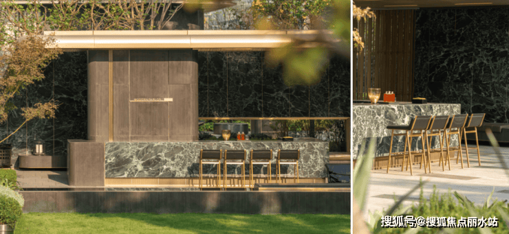 一旁,休闲吧台与躺椅在草坪边相得益彰,线条简约流畅,尽显优雅,吧台台面光洁,奢石纹理尽显自然奢华,搭配灵动高脚凳,满溢时尚气息。