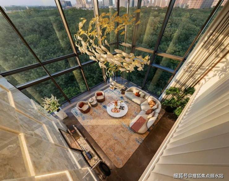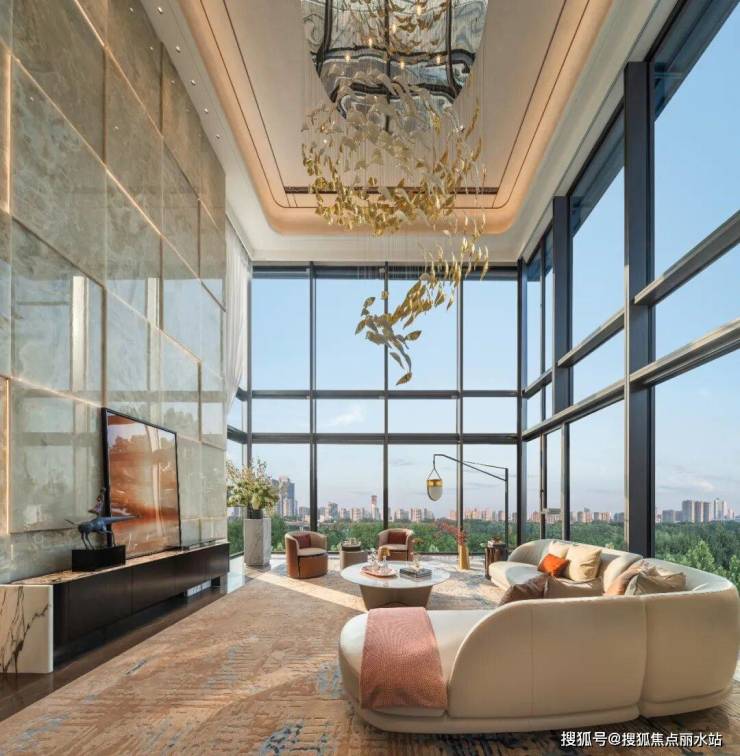 绿城华发·金陵月华在400㎡大平层的水平尺度感中,设计7米挑高客厅,营造别墅的纵向空间感,真正实现“空中别墅”的居住体验。