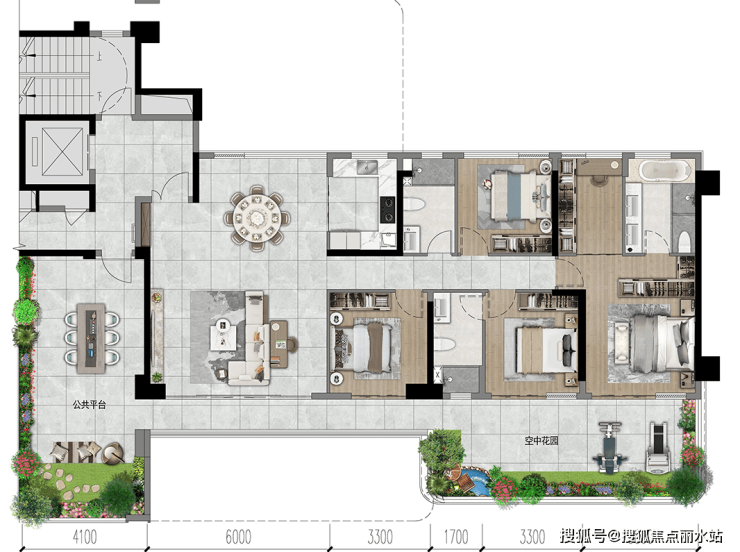 空中花园的加入,不是简单的功能区量变,而是涉及生活方式迭代的巨大变化。原来围绕客餐厨开展起居的生活模式,升级为室外和室内互动的田园生活方式,因此空间设计要顺势而为,以人为本,围绕客户的居家生活行为习惯展开,强化人与自然的互动和谐。设计上强调餐厨客体系与阳台及花园的内外呼应,形成的洄游动线有效的串联起了所有区域,使室内外有机互动,同时公共休闲庭院,与私密性休闲茶室区分置,动静分区合理。