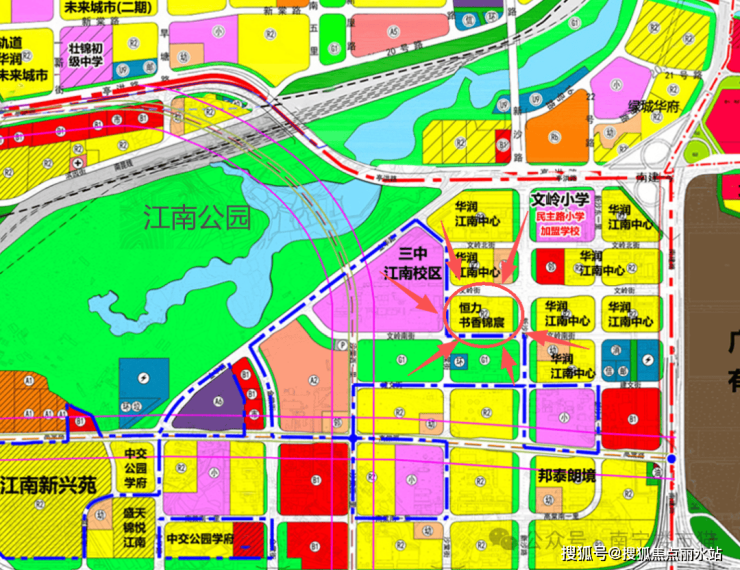 从控规图可以看到,江南公园周边规划仅有南宁三中江南校区这一所初中,因此,未来恒力书香锦宸的学区基本无疑就是这个中学了。