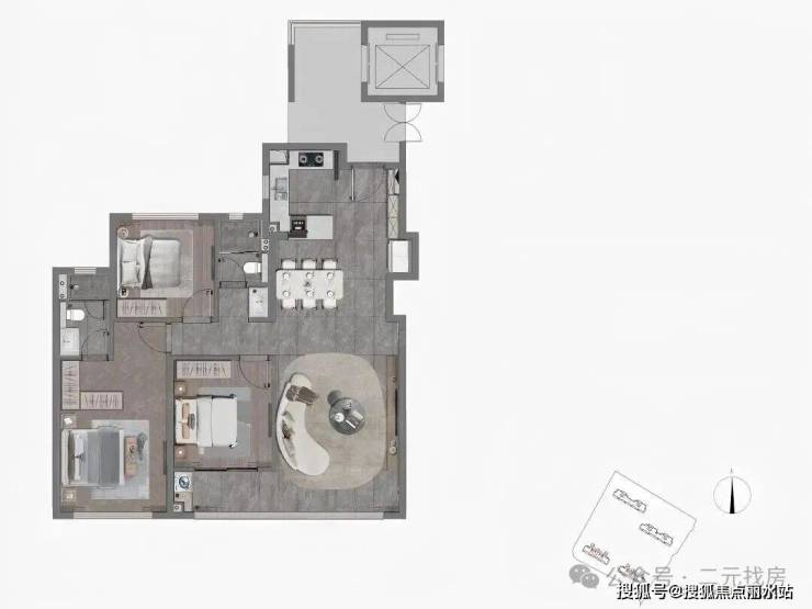 3号楼总高32层,2梯3户,一个单元,边户139㎡、中间户116㎡,中间户带连廊,东边户为纯边户,西边户和中间户共用一个电梯。