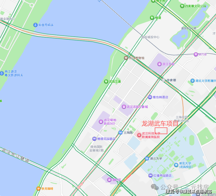 自驾:项目周边横向路网有友谊大道、和平大道;纵向路网有武汉长江公铁隧道、武汉长江隧道、武汉长江二桥,开车出行挺方便,就是容易堵车(高德地图的“红色”表示拥堵)。