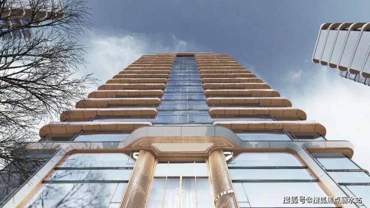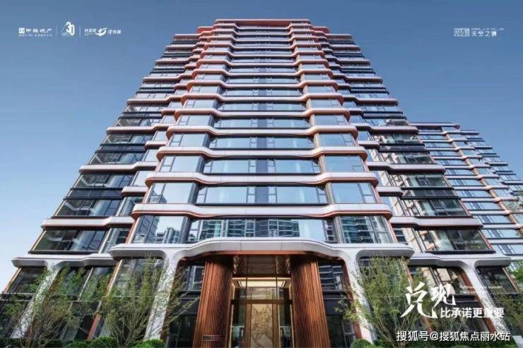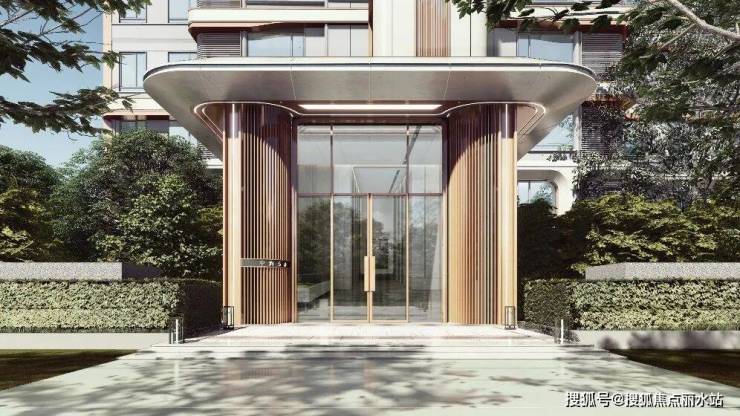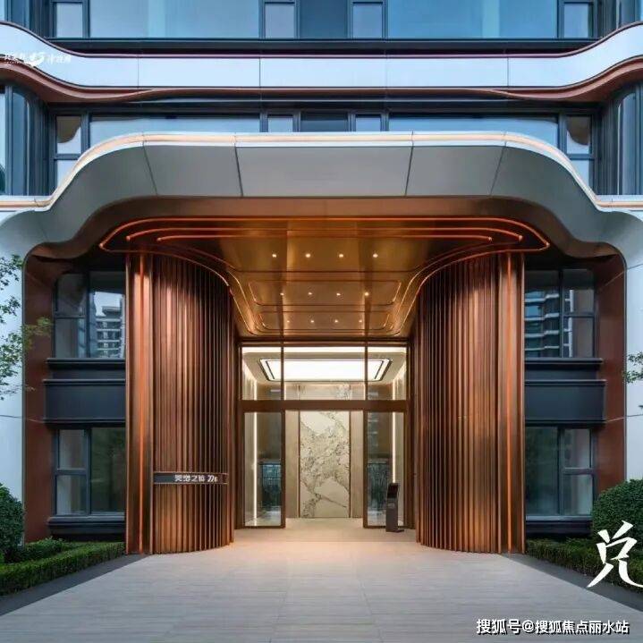 入户大堂主体采用玻璃材质,形成干净,通透的视觉感受,同时入口两侧则采用古铜色金属线条以内凹的弧形进行排列,在立面形式上给人以欢迎,拥抱的精神感受,在色调上形成温暖的居住氛围。