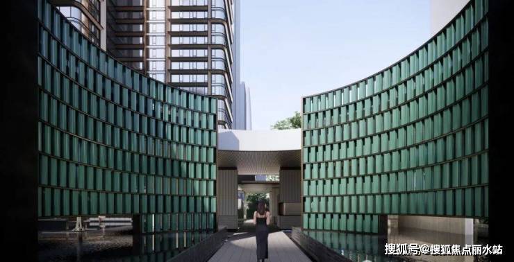 社区的主入口还将打造一座城市级的雕塑,绿陶板的流光肌理与金属收边,碰撞出中北路上的“只此青绿”。进入大门,则是6米高的定制绿陶板组成的环形门庭,让归家变得充满仪式感。