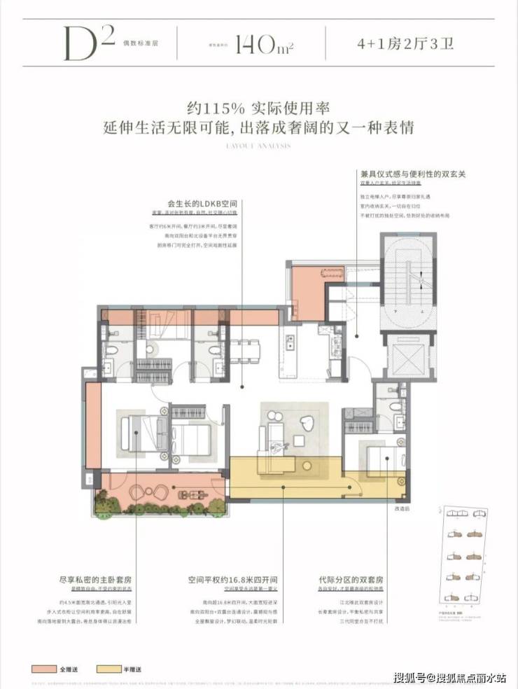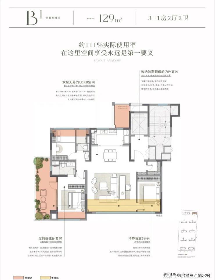 这是建面约129㎡的其中一个户型,实际使用率约111%,主卧套房极具度假感,不仅享有90度双面采光,还独享约6米宽的观景露台,舒适度极高。